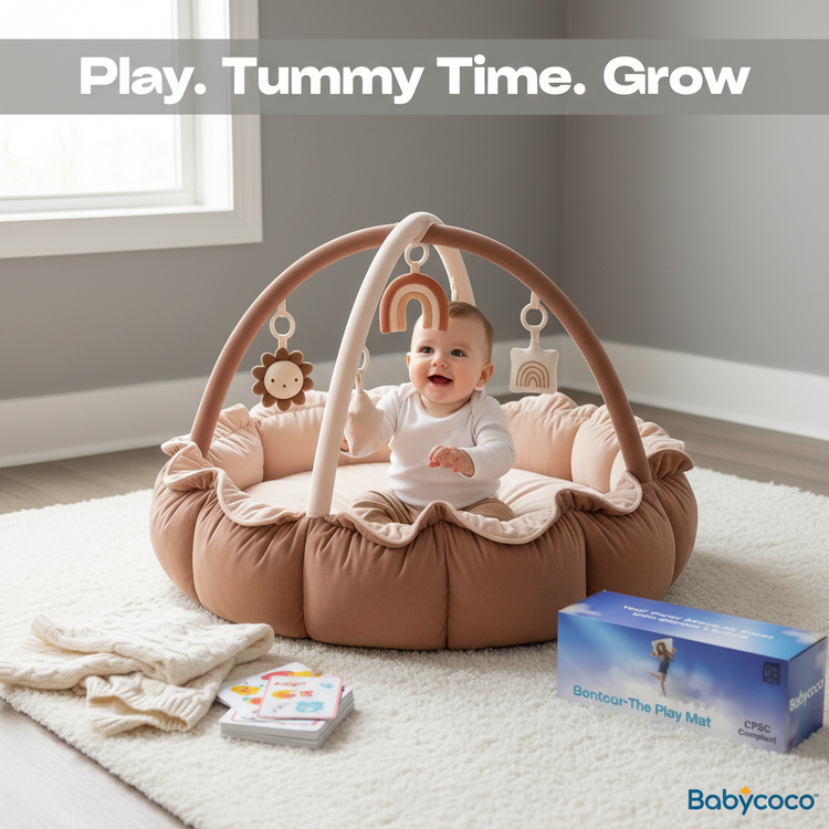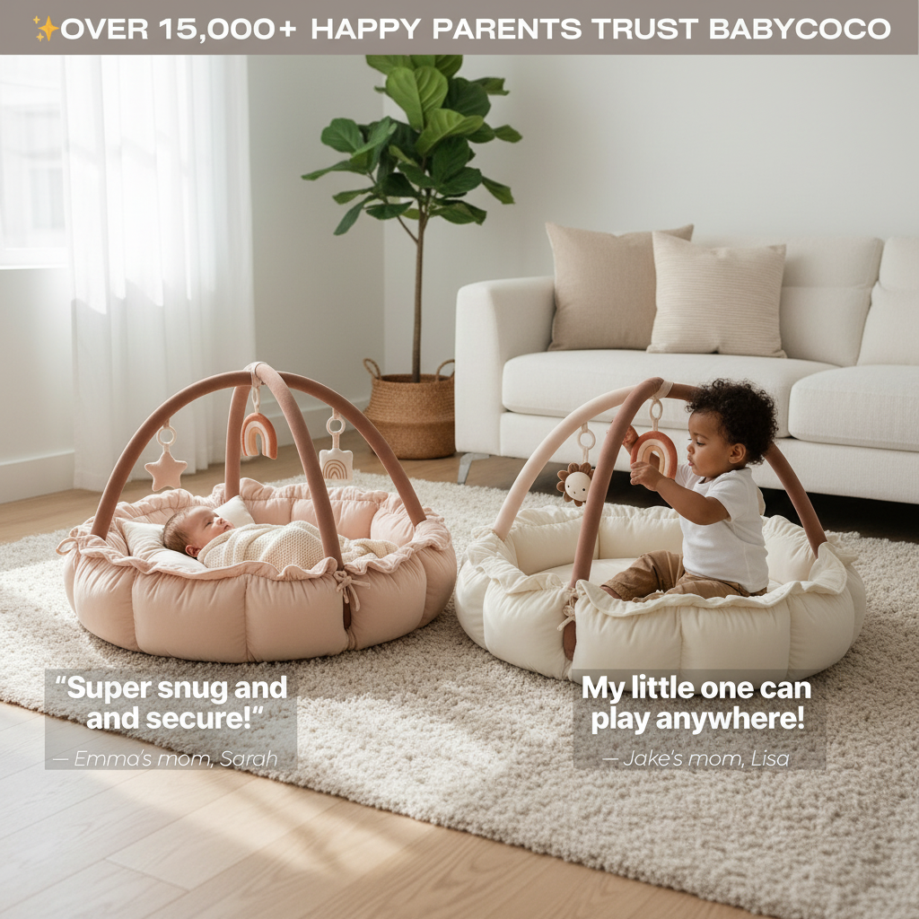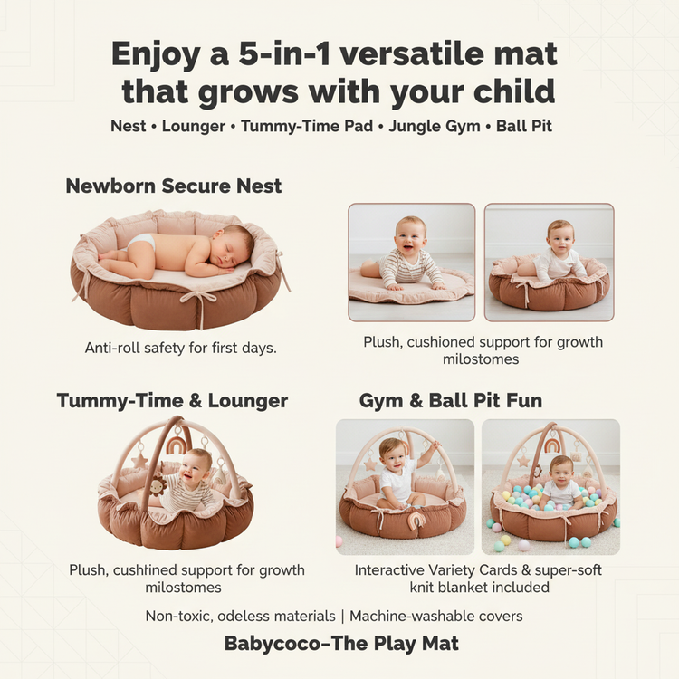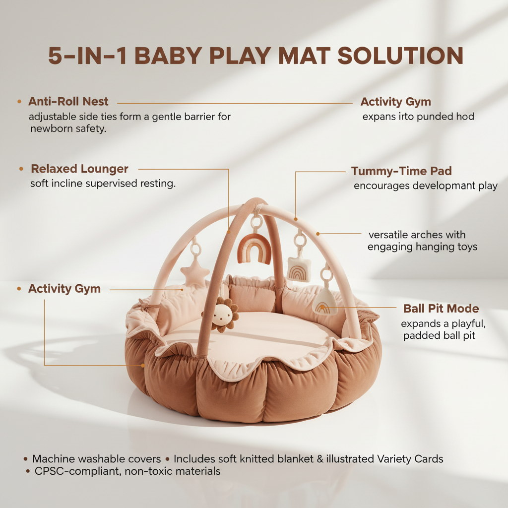 Enjoy a 5-in-1 versatile mat that grows with your child: nest, lounger, tummy pad, gym, and ball pit. Plus, anti-roll barriers, interactive Variety Cards, and a super-soft knit blanket—all made from non-toxic, odorless materials and machine-washable fabrics.